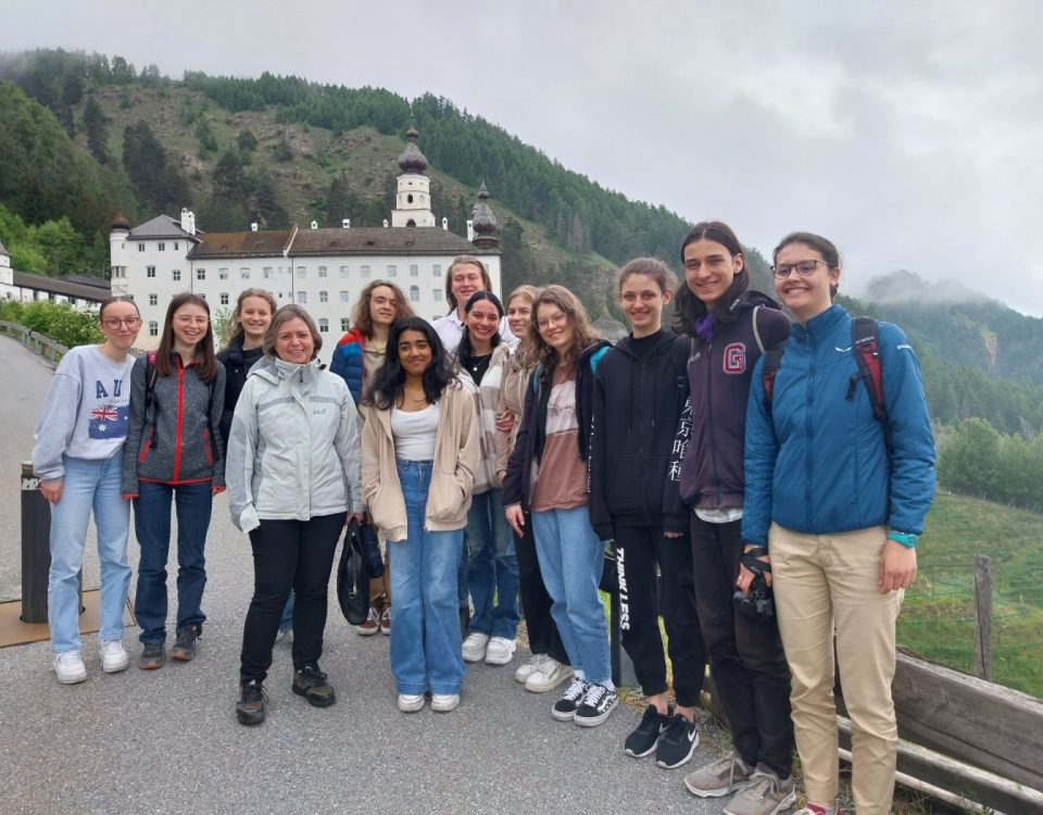 Gruppenbild der Frankenbergschülerinnen mit Direktorin Mechthild von Spinn (r)