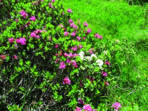 Wir müssen noch höher hinauf, über den Kamm, und dann geht es leicht abwärts, bis wir oberhalb der Grünbodenhütte mit der Bergstation der Umlaufbahn ankommen. Zur Zeit der Alpenrosenblüte sind die Hänge hier ein Meer in Rot. Nun brauchen wir nicht mehr ganz hinunter bis zur Hütte, sondern finden etwas oberhalb gleich den weiterführenden Panoramasteig. In leichtem Auf und Ab mit einmaliger Sicht ins Tal, ebenso wie zu den umgebenden Berggipfeln wandern wir weiter. Teils geht es über große Felsplatten, an zwei Marterlen für verunglückte Bergsteiger vorbei, teils über schmale Pfade. Bald sehen wir bereits die zweite Alm, die etwas tiefer liegt.