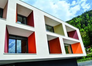 In der Zentrale in Partschins wurde im vergangenen Jahr intensiv am Bau eines zweistöckigen Verwaltungsgebäudes gearbeitet. Die geplante Bauzeit von einem Jahr wurde dank der guten Zusammenarbeit zwischen den Bauherren, den Planern und den ausführenden Handwerksbetrieben und Lieferanten termingerecht eingehalten. Mit Mitte Mai wurden die Büros im ersten und zweiten Obergeschoss bezogen, welche ein Ausmaß von insgesamt 950 Quadratmetern haben. Beim Neubau wurden 165 Tonnen Estrich eingebaut, und das Gebäude hat eine gesamte Putzfläche von 2661 Quadratmeter! Warme Erdtöne aus der RÖFIX-Farbpalette setzen dabei interessante farbliche Akzente. Aushängeschild des gesamten neuen Verwaltungsgebäudes ist die mineralische Designputzfassade mit zerhackten Muschelteilen, die die Aufmerksamkeit des Betrachters erregt. Bei Sonneneinstrahlung kommt der Glitzereffekt besonders beeindruckend zur Geltung. Da beim Bau des Verwaltungsgebäudes RÖ­FIX-Produkte aus allen Segmenten verwendet wurden, ist das neue Gebäude gleichzeitig ein Schauobjekt für RÖFIX-Produkte und Systemlösungen. Die kantige Form des Gebäudes wurde in Anlehnung an das RÖFIX-Logo gewählt, auffallend sind die in Gelb, Orange und Naturtönen gestrichenen, nicht begehbaren Nischen der großflächigen Fenster. Die in der Nacht beleuchteten Nischen setzen den neuen RÖFIX-Firmensitz gut in Szene. Das Flachdach des Firmengebäudes ist begrünt; für ein optimales Raumklima sorgt eine effiziente Deckenlüftung im Inneren des Gebäudes.