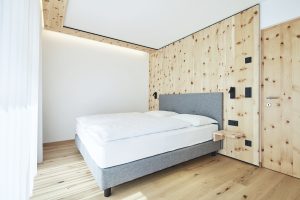 Entstanden sind dabei drei schicke neue Ferienwohnungen. Die Neugestaltung erfolgte in Holzertigbauweise, wobei auf eine Vertäfelung mit Zirbenholz gesetzt wurde. „Die großflächigen Wandverschalungen sind glatt, linear und schnörkellos“, erklärt der Architekt. Überhaupt findet man viel Holz in den Wohnungen, der Boden etwa besteht aus Eichenholz. Die gesamte Einrichtung der Wohnungen wurde ebenfalls von Christian Kapeller geplant. „Hier war die Idee, eine zeitgemäße und lineare Einrichtung zu realisieren und dabei auf Bequemlichkeit, Komfort und Wohlfühlatmosphäre zu setzen“, erklärt der Architekt. Beim Licht entschied man sich für eine indirekte Beleuchtung. Die Möbel selbst sollten ebenfalls linear und komfortabel sein.