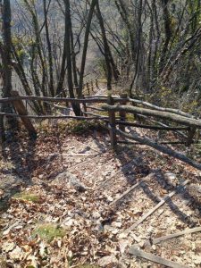 Bei einem alten Olivenbaum erfahren wir, dass Kurtatsch seit neuestem als Olivendorf bezeichnet wird. Wohl schon zurzeit der Römer wurden hier Ölbäume gepflanzt, gingen aber in der kleinen Eiszeit fast gänzlich ein und erfreuen sich dank der Klimaerwärmung neuerdings ihres Gedeihens. Nur noch kurz aufwärts, dann kommen wir zum Waldrand. Hier sind Tisch und Bank und eine gute Möglichkeit zu einer Trinkpause. Kleine, tönerne Amphoren weisen uns den Weiterweg und wir staunen, wie viele Traubensorten hier gedeihen. Einige Stufen hinunter erreichen wir einen Aussichtsplatz mit einem Fernrohr. Welche Bewandtnis es damit wohl hat? Zuvor entdecken wir die ersten Blüten einer Felsenbirne.