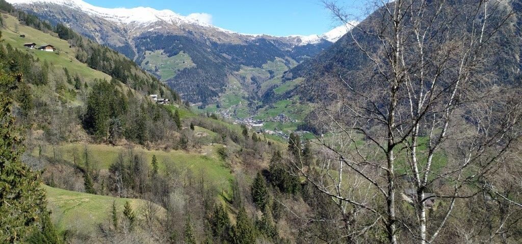 Die wunderbare Sicht hinein nach St. Leonhard mit dem darüberliegenden Weiler Glaiten und dem Hippolyt-Kirchlein, wie auch zur Talseite gegenüber und hinauf zur Fartleisalm und Riffelspitze entschädigt uns für den Asphalt. Wir müssen ins Tal hinein, durch einen Tunnel, später dann über eine Holzbrücke. Ging es erst immer eher abwärts, so steigt jetzt die Straße wieder an. Am Kruster vorbei erreichen wir den stattlichen Weiherhof und damit endet endlich der Asphalt. Über einen schönen Steig wandern wir abwärts zum nächsten Hof. Ab jetzt folgen wir der Markierung 7. Zwischen Haus und Scheune geht es sofort in eine Wiese, die zum Wald hinunterführt. Zunächst wandern wir auf einem schmalen Steig bis zu einem geköpften Masten.