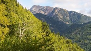 Wir lassen den Marterhof und den Eirnberghof hinter uns und wählen nun den nicht markierten, links abzweigenden Weg, der bis zum Untersalmberghof leicht ansteigt. Diese drei Höfe gehören mit den übrigen neun, in diese steile Einsamkeit gestreuten Hofstellen zum Weiler Vormeswald, der einst sogar eine Zwergschule hatte. Wir kommen wieder auf eine asphaltierte Zufahrtsstraße, die wir nun zügig abwärts gehen. Endlich zweigt rechts der markierte Wandersteig ab, dem wir nun dankbar folgen und der die weiten Serpentinen abkürzt.
