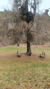 Gleich hinter der Wallfahrtskirche Maria Saal mit der Madonna unterm Regenschirm führt unser Pfad, mit der Markierung 8, Kreuzwegstationen entlang, erst abwärts und dann am Heidgerberhof (ehemaliger Hofsschank) vorbei, zum „Hexenbödele“. Einst sollen hier rund um die alte Lärche die Hexen getanzt haben. Der „Hexenbesen“ darauf ist eine genetisch bedingte Astwucherung, die den Hexen zugeschrieben wurde. Heute hat das Kreuz an der Lärche den alten Hexenglauben abgelöst. Zurück zum Waldweg, wandern wir diesen abwärts und dann, beim Wegweiser 8 A, durch ein Gatter rechts über Lärchenwiesen hinunter in Richtung St. Verena. Wir kommen zur Straße und wenden uns ober dem stattlichen Oberschlichterhof mit seinen schönen Fresken auf dem asphaltierten Sträßchen nach links, bis beim Vogelhauser rechts ein schöner, alter Steig abwärtsführt.