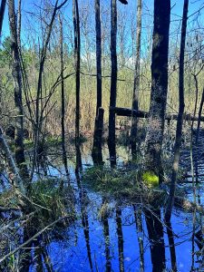 Jenseits, etwas rechts, wiederum eine Schranke, dann wenige Schritte den breiten Weg aufwärts und noch unter dem Geländer sofort nach links zu einem unmarkierten, aber gut sichtbaren Steig. Oberhalb des urigen Sumpfgebietes, diesem entlang, bis zur Straße. Vor uns sind die großen Fußballfelder von Rungg. Den Rungger Wald aufwärts, erreichen wir in einem weiten Bogen nach rechts auf einem Forstweg eine Kreuzung mit Tisch, Bänken und einem Wegkreuz. Wir folgen ansteigend der Markierung 2 über Stufen und einem Geländer entlang. Dann stehen wir wiederum auf einer Kreuzung. Statt jetzt nach rechts zum Kleinen Montiggler See abzubiegen, wandern wir einen breiten, unmarkierten Weg weiter aufwärts.