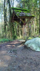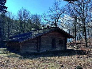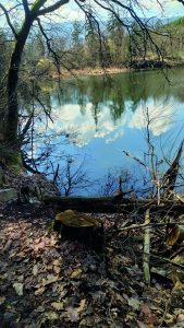 Wir kommen am Wasserspeicher vorbei, biegen nun nach rechts abwärts. Hier ist viel abgeholzt worden und es geht durch eine Tannenschonung. Bei der nächsten Kreuzung folgen wir in dieselbe Richtung einem breiten Fahrweg. Jetzt ist die schmucke Forsthütte erreicht! Der wunderbare Platz hat alle Mühe gelohnt. Etwas weiter vorne sind zwei Rastbänke. Die Aussicht hier ist großartig! Von oben können wir beide Montiggler Seen in ihrer ganzen Schönheit bewundern, samt Stille und Einsamkeit. Nach ausgiebiger Mittagsrast gehts den breiten Weg bis zur Kurve zurück und dann, auf dem Weg bleibend, links abwärts.