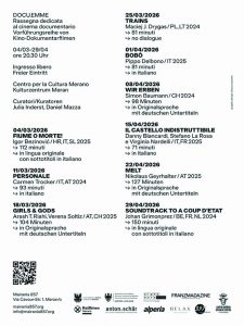 Die Infos zum Programm und den Filmen findet man hier: https://www.mairania857.org/de/evento/docu-emme-2026/ https://www.facebook.com/docuemme